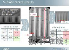 目前,IMEC正在嘗試試制適于太陽(yáng)能電池的硅納米線。要實(shí)現(xiàn)1.7~1.8eV的帶隙,硅納米線的直徑需要降至2~4nm。為形成這種極細(xì)的硅納米線,IMEC采用了為制造新一代半導(dǎo)體而開發(fā)的EUV曝光。