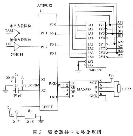 跟蹤系統(tǒng)中微處理器選用89系列性價(jià)比高和功耗低的89C52。74HC14芯片是6非門施密特觸發(fā)器,與P1.1和P1.2口相連,控制方位限位信號(hào)。74HC240芯片,八反相三態(tài)緩沖器/線驅(qū)動(dòng)器,用于數(shù)據(jù)緩沖及總線驅(qū)動(dòng)。系統(tǒng)使用兩片74HC240芯片,通過P0口引腳控制,兩片74HC240的16個(gè)輸出引腳作為步進(jìn)電機(jī)驅(qū)動(dòng)電路的輸入控制信號(hào),分別控制步進(jìn)電機(jī)俯仰方向和水平方位的正反轉(zhuǎn)。系統(tǒng)與上位機(jī)的通信選用MAX485接口芯片,由P1.0口控制其收發(fā)狀態(tài)。驅(qū)動(dòng)器接口電路如圖3所示。