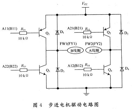 步進(jìn)電動(dòng)機(jī)是一種用電脈沖信號(hào)進(jìn)行控制,并將電脈沖信號(hào)轉(zhuǎn)換成相應(yīng)角位移的執(zhí)行器。在跟蹤系統(tǒng)中,以74HC240的16個(gè)輸出信號(hào)作為步進(jìn)電機(jī)驅(qū)動(dòng)器的輸入控制信號(hào),用以控制步進(jìn)電機(jī)俯仰方向和水平方位的正反轉(zhuǎn)。圖4所示的是步進(jìn)電機(jī)一路驅(qū)動(dòng)電路圖,系統(tǒng)共有四路驅(qū)動(dòng)電路,分別驅(qū)動(dòng)步進(jìn)電機(jī)俯仰方向和水平方位的正反轉(zhuǎn)。