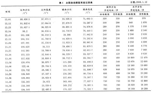 表1中列出了2009年1月12日中午至下午三時(shí)左右的理論數(shù)據(jù),并用系統(tǒng)的手動(dòng)校準(zhǔn)功能,記錄下不同時(shí)刻的步進(jìn)電機(jī)實(shí)際運(yùn)行步數(shù)。