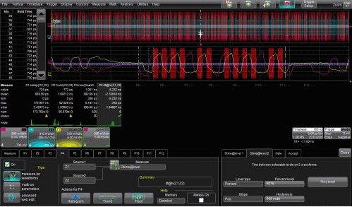 圖4顯示的是另一項測量技術。在這里,被選定的一組寫周期用掃描縮放(ScanZoom)分離出來。參數門限進一步隔離出僅有12個寫周期并僅在信號正邊沿測量出兩個信號的時間差(P4)。WaveScan為您提供了一種可以測定DDR2設備的工具。