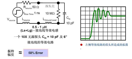 探頭接地引線實(shí)質(zhì)可以等效為電感效應(yīng),接地引線電感與探頭及示波器的輸入電容形成串聯(lián)諧振電路。而探頭的輸入電阻則在諧振電路中引入阻尼。電感效應(yīng)會(huì)造成阻抗不匹配,而且是帶寬越大影響就越大。等效電感的大小與接地線長(zhǎng)度有關(guān),其越長(zhǎng)電感效應(yīng)就越大,對(duì)波形的破壞效應(yīng)就是會(huì)產(chǎn)生脈沖信號(hào)的振蕩、過(guò)沖等信號(hào)完整性問(wèn)題帶有接地引線電感的示波器探頭等效電路及效應(yīng)如下圖4。