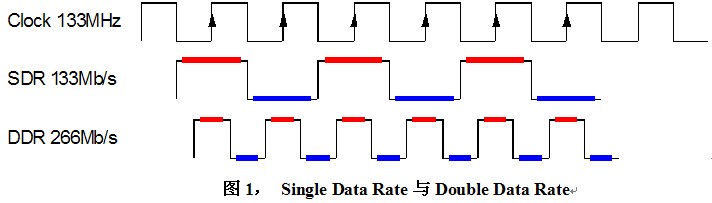 內(nèi)存技術(shù)從SDR,DDR,DDR2,DDR3一路發(fā)展而來,傳輸速度以指數(shù)遞增,除了晶圓制造工藝的提升因素之外,還因?yàn)椴捎昧薉ouble Data Rate以及Prefetch兩項(xiàng)技術(shù)。實(shí)際上,無論是SDR還是DDR或DDR2、3,內(nèi)存芯片內(nèi)部的核心時(shí)鐘基本上是保持一致的,都是100MHz到200MHz(某些廠商生產(chǎn)的超頻內(nèi)存除外)。DDR即Double Data Rate技術(shù)使數(shù)據(jù)傳輸速度較SDR提升了一倍。如下圖所示,SDR僅在時(shí)鐘的上升沿傳輸數(shù)據(jù),而DDR在時(shí)鐘信號(hào)上、下沿同時(shí)傳輸數(shù)據(jù)。例如同為133MHz時(shí)鐘,DDR卻可以達(dá)到266Mb/s的數(shù)傳速度。