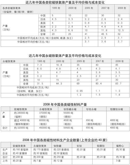 中國磁性材料產(chǎn)量以15%以上的年增長率發(fā)展,到2008年,中國軟磁鐵氧體產(chǎn)量已達(dá)32萬噸,永磁鐵氧體45萬噸,燒結(jié)釹鐵硼永磁5萬噸,粘結(jié)釹鐵硼永磁0.45萬噸,釤鈷永磁0.65萬噸,鋁鎳鈷永磁0.4萬噸。