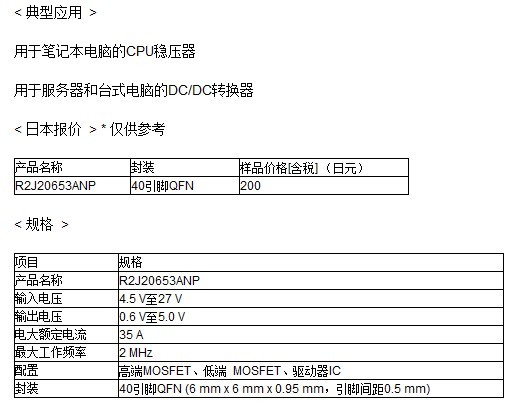 長(zhǎng)期以來,瑞薩一直在提供符合DrMOS標(biāo)準(zhǔn)的一系列產(chǎn)品,尤其是輸出電壓為12V的服務(wù)器和臺(tái)式電腦。新的R2J20653ANP將可承載的輸入電壓擴(kuò)展到適用于筆記本電腦的20V適配器電壓,成為瑞薩高電壓容限電源類的首款產(chǎn)品。這款產(chǎn)品的推出有助于筆記本用CPU電源在實(shí)現(xiàn)更加小型化的同時(shí),達(dá)到更高的性能,并且有望帶動(dòng)DrMOS標(biāo)準(zhǔn)更加廣泛的應(yīng)用。