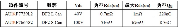 采用新款大罐式封裝的 AUIRF7739L2 具有業(yè)內(nèi)最低的導(dǎo)通電阻,在給定 PCB 區(qū)域 40V 電壓時(shí)的導(dǎo)通電阻典型值僅為 0.7mΩ 。此外,與 D2PAK 相比,大罐式封裝的占位面積可以減少60%,厚度可以降低85%。這款器件可提供卓越的功率密度和效率,非常適合高負(fù)載電機(jī)控制應(yīng)用,包括電動(dòng)助力轉(zhuǎn)向系統(tǒng) (EPS) 和微型混合動(dòng)力車的電池開關(guān)和集成式起動(dòng)發(fā)電機(jī) (ISA) ,以及底盤、傳動(dòng)系統(tǒng)和動(dòng)力系統(tǒng)等。