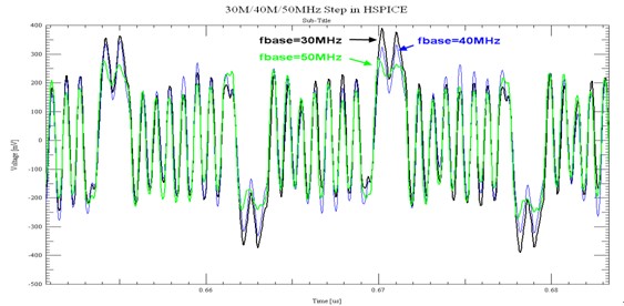 圖9:HSPICE網(wǎng)表文件的S參數(shù)模型的fbase在不同設(shè)定時(shí)仿真結(jié)果