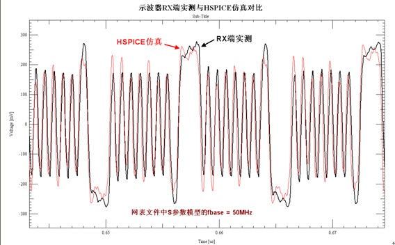 在圖9中分別為fbase=30/40/50MHz時(shí),HSPICE仿真出的接收端波形??梢钥吹絝base=50MHz時(shí),低頻的碼型(長1或長0)幅度較低些,與實(shí)測RX端波形的比較接近。在使用HSPICE仿真時(shí),fbase=50MHz時(shí)的仿真時(shí)間遠(yuǎn)小于最開始的頻率設(shè)置(fbase = 10MHz)。在圖10中,對(duì)比了fbase=50MHz時(shí)HSPICE仿真的RX端波形與實(shí)測波形,兩者一致性比較好。