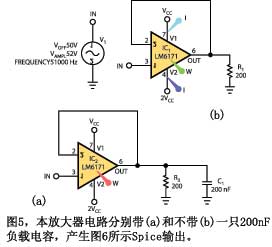 如果你能確定IC通過信號的特性,就可以用Spice來估算功耗。此時(shí)必須保證使用恰當(dāng)?shù)腟pice模型,它們對一些測試信號給出合理的結(jié)果,而功耗計(jì)算此時(shí)沒有價(jià)值。圖5表示一個(gè)Spice圖。芯片的功耗不同于到達(dá)負(fù)載的功率。圖6是圖5示意圖的Spice曲線圖。它以紅線表示啟動(dòng)的振蕩。電路是否會(huì)發(fā)生這種振蕩只是個(gè)人的猜測,但它應(yīng)該會(huì)使你在建立原型后查看這種行為。記住,在OrcadCapture上點(diǎn)擊W鍵只能顯示芯片的靜態(tài)功耗。要獲得工作時(shí)的功耗,要用示意圖上的功率標(biāo)記,然后用曲線程序的rms-math函數(shù),給出器件的平均功耗。