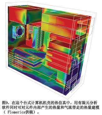 美國國家半導(dǎo)體的Webench在線設(shè)計工具采用Flomerics的Flotherm熱分析軟件,計算靜止空氣中的器件溫度。所有一般的仿真注意事項均適用。如果你的電路有風(fēng)扇和一些氣流,其溫升就較低。如果有機(jī)箱,里面還有其它器件,其溫升就高。Flomerics采用有限元方案技術(shù)(參考文獻(xiàn)5)。圖9顯示了一個計算機(jī)機(jī)殼發(fā)熱與氣流的分析結(jié)果。很多其它有限元解算器也可以分析這種問題。例如,Comsol的一個解算器可以完成多重物理分析,可以解算超過一個問題的偏微分方程,如一只部件的熱響應(yīng),部件的導(dǎo)熱性能隨其溫度而變化。TI的Edwards指出,他的公司提供二種級別的熱建模抽象:ΦJB熱阻,以及Delphi緊湊模型標(biāo)準(zhǔn)。Flotherm、Icepak和很多其它熱分析程序都使用這些模型?! ?br />