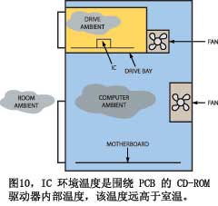 無疑,當(dāng)大多數(shù)工程師沒有理解環(huán)境溫度的嵌套程度時,他們就會失敗。例如,假設(shè)要設(shè)計一個部件,用于CD播放機(jī)的光學(xué)拾取裝置(圖10)。你可能會這么假設(shè),由于該部件用于消費(fèi)產(chǎn)品,它可能工作在0℃~70℃。但好好想想吧。實驗室工作臺上的部件可能是工作在25℃環(huán)境下。而光功率件是要安裝在CD驅(qū)動器里,驅(qū)動器中有其它元件在加熱空氣,該裝置可能不裝風(fēng)扇。更糟糕的是,播放機(jī)裝在計算機(jī)內(nèi),驅(qū)動器必須工作在這種環(huán)境溫度下。計算機(jī)內(nèi)部有自己的熱源和風(fēng)扇,這個溫度上再加上外部環(huán)境溫度,因此,在工作臺上測得的25℃室溫,到了計算機(jī)內(nèi)就是40℃,CD驅(qū)動器內(nèi)是50℃?,F(xiàn)在,如果你把計算機(jī)放在厄瓜多爾的一個很熱的閣樓上,情況又該如何?這個部件必須工作在遠(yuǎn)高于70℃的環(huán)境溫度下。你的職責(zé)是確保它仍能滿足規(guī)范,并且高溫不會顯著縮短產(chǎn)品的壽命。