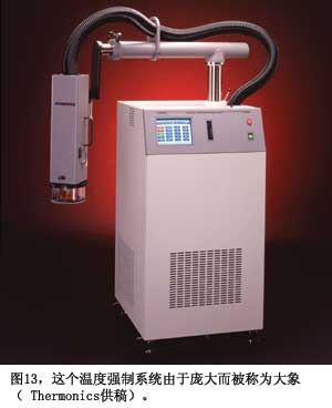 做測量只是檢查真實情況,驗證自己的假設(shè)與估算的一個部分。如果沒有可用的環(huán)境溫度,你還必須自己創(chuàng)造出來。汽車公司會在亞利桑那州和加拿大做跟蹤測試,對于電子測試,采用臺面測試室或溫度強(qiáng)制系統(tǒng),如Thermonics的T-2500E型(圖13)。要確保使用的電纜和測試線可以承受熱量。BrownBNC電纜有較高的額定溫度,優(yōu)于更常用的黑色U58型線(參考文獻(xiàn)9)。熱風(fēng)槍的快速氣流就可以加熱IC,但要小心,IC可能很容易被熱風(fēng)槍毀壞。制