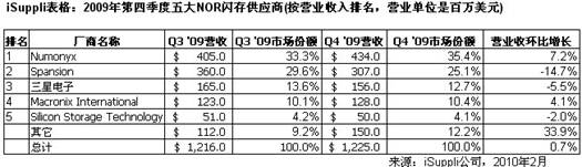 Numonyx在2009年第三季度成為頭號(hào)NOR閃存供應(yīng)商,第四季鞏固了這一位置。該公司的NOR閃存營(yíng)業(yè)收入增長(zhǎng)到4.34億美元,比第三季度時(shí)的4.05億美元增長(zhǎng)7.2%。更重要的是,它在整體NOR閃存市場(chǎng)中的份額從第三季度時(shí)的33.3%上升到了35.4%。