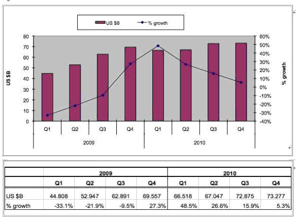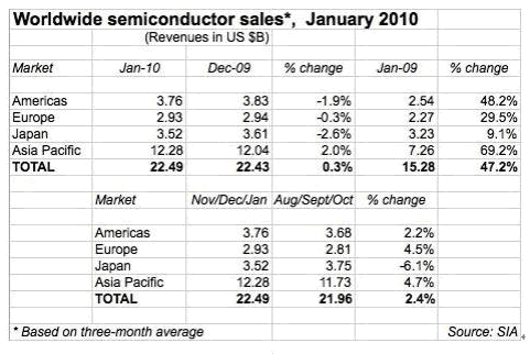 按SIA總裁的看法,全球半導(dǎo)體銷售額1月的最新數(shù)據(jù)(三個(gè)月的移動(dòng)平均值) 比12月的225億美元上升0,3%,分析推動(dòng)市場(chǎng)增長(zhǎng)在眾多方面,包括計(jì)算機(jī),手機(jī),汽車電子和工業(yè)應(yīng)用。如果與去年同期相比,銷售額增長(zhǎng)達(dá)47%,顯然與09年1月時(shí)正值全球的最低點(diǎn)有關(guān)。