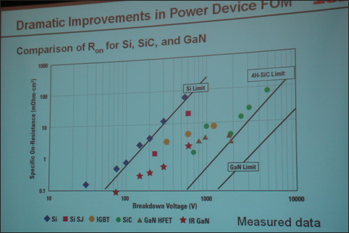 這個(gè)采用氮化鉀材料的新器件可以將系統(tǒng)的效率改善3.5%到7%,采用簡(jiǎn)單的熱控制即可達(dá)到節(jié)能效果,在目前綠色節(jié)能的大趨勢(shì)下可以發(fā)揮重要作用。在改善功率器件的優(yōu)值系數(shù)方面,這個(gè)氮化鎵 (GaN) 功率器件也表現(xiàn)突出,如下圖所示。