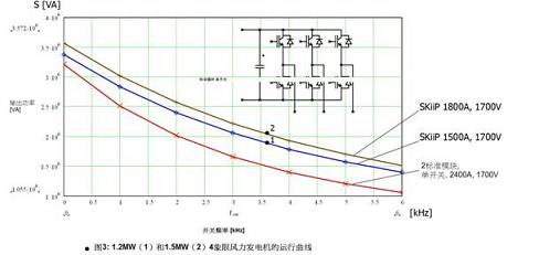 兩個(gè)單管模塊將提供一個(gè)2.4kA的半橋。比較計(jì)算的結(jié)果可以看到,與放置在最大外殼中的標(biāo)準(zhǔn)模塊相比,采用SKiiP的方案可在整個(gè)開關(guān)頻率范圍內(nèi)提供更高的輸出電流??捎媚孀兤鬏敵龉β逝c開關(guān)頻率的關(guān)系見圖3。