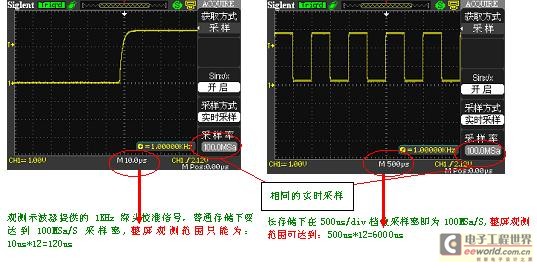 提高示波器的存儲深度可以間接提高示波器的采樣率。以一臺采樣率為1Gsa/s、存儲深度為20K的示波器為例來說,只要水平掃描速度在20ns/div以上時基,采樣速度就會急速下降。因為當(dāng)需要測量較長時間的信號波形時,必然要求大的時基檔位,這就造成采樣率的下降,采樣率的下降可能會遺漏信號的細(xì)節(jié)勢必造成信號波形質(zhì)量的下降。這時候就需要大的存儲深度來維持更高的采樣率來采樣測量。長存儲在保證獲取不失真的波形的同時又可以觀察更長時間的信號。