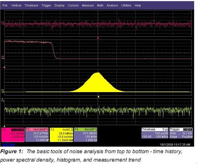 電路中的每個電子元器件會產(chǎn)生隨機(jī)噪聲。隨機(jī)噪聲的分析需要時域、頻率、統(tǒng)計域的工具。力科示波器具有表征隨機(jī)噪聲的能力,該應(yīng)用將主要展示這些功能。
