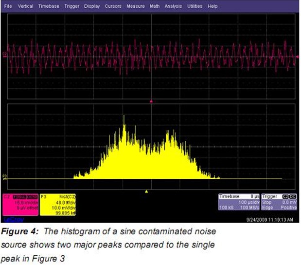 噪聲呈高斯分布,平均值和標(biāo)準(zhǔn)方差用來描述噪聲的概率密度函數(shù)(pdf)。直方圖提供了測量參數(shù)分布的簡單視圖。Figure 3 顯示了采集樣本值的直方圖。該直方圖為用戶提供了帶有被測過程的概率密度函數(shù)的估計。這個數(shù)據(jù)可以使用直方圖參數(shù)解釋。Figure 3 顯示了3個直方圖參數(shù),hmean,hsdev,和range,分別是平均值,標(biāo)準(zhǔn)方差,范圍的直方圖分布。直方圖可由單次采樣或多次采樣計算出來。這兩種情況都能提供被研究過程的大量本質(zhì)認(rèn)識。這個例子中的偽高斯分布表明信號源是一個隨機(jī)過程。