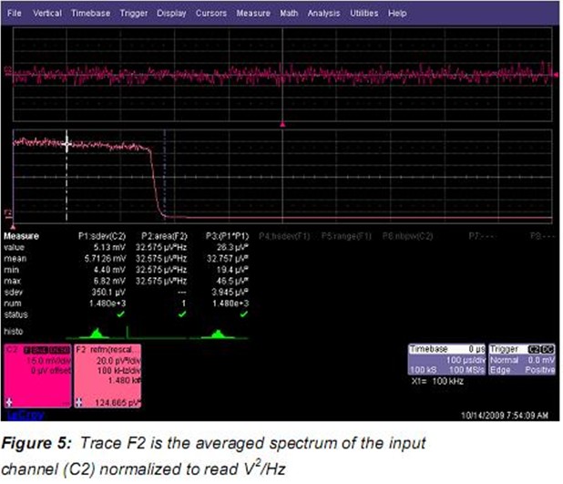 跡線F2中的光標(biāo)讀數(shù)可以直接讀取Figure 5中所示的點功率譜密度。光標(biāo)設(shè)置到100kHz讀數(shù)為 124.665pV2√Hz。