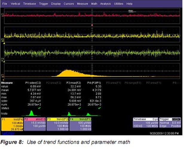 參數(shù)統(tǒng)計包括最小和最大值。如果想查看采集接著采集的參數(shù)變化可以使用趨勢功能。趨勢繪出了每個測量值vs 順序事件數(shù)的變化。Figure 8中顯示的函數(shù)跡線F4就是參數(shù)P1的趨勢。P1是通道C2的標(biāo)準(zhǔn)方差。標(biāo)準(zhǔn)方差參數(shù)每一次采集產(chǎn)生一個值,而F4順序顯示測量到的每一個讀數(shù)。趨勢圖可以看成一種任意波形,可以使用任何數(shù)學(xué)或測量工具對其分析。