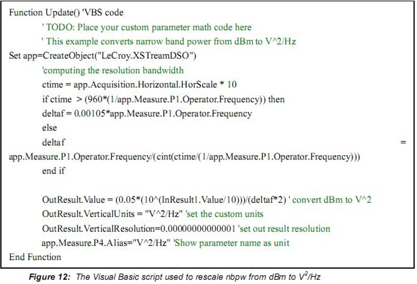 另一個進(jìn)行噪聲“點”測量的方法是采用可選的窄帶功率測量。窄帶功率(nbpw)通過計算給定頻率上的離散傅里葉變換測量功率。Nbpw的單位是dBm。噪聲測量不太方便,我們希望用噪聲功率譜密度線性單位V2√Hz來進(jìn)行測量。幸運(yùn)的是,力科示波器可以用腳本使用參數(shù)數(shù)學(xué)修改測量。這允許更復(fù)雜的計算而不是Figure 9所示的參數(shù)的簡單比率峰值系數(shù)。