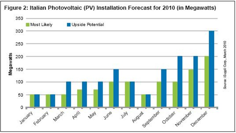 圖2所示為iSuppli公司目前對2010年意大利安裝容量的預測,以及當年潛在的上升空間。