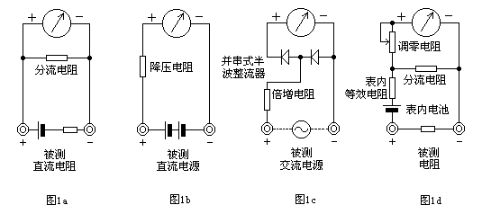 如圖1d所示,在表頭上并聯(lián)和串聯(lián)適當(dāng)?shù)碾娮?,同時串接一節(jié)電池,使電流通過被測電阻,根據(jù)電流的大小,就可測量出電阻值。改變分流電阻的阻值,就能改變電阻的量程。