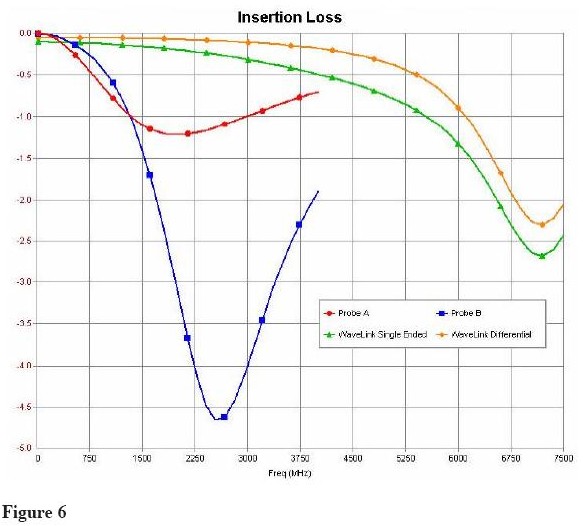 為了比較差分探頭的性能,通常在良好定義和常數電路中畫出負載效應。比如,每個探頭在50歐姆理想環(huán)境中產生的插損如Figure 6所示。插損用dB表示;作為電壓表示,必須除以20,采用反對數。比如Probe B導致的4.6dB的插損會產生41%的幅度損失。這對于被探測的信號有顯著影響。
