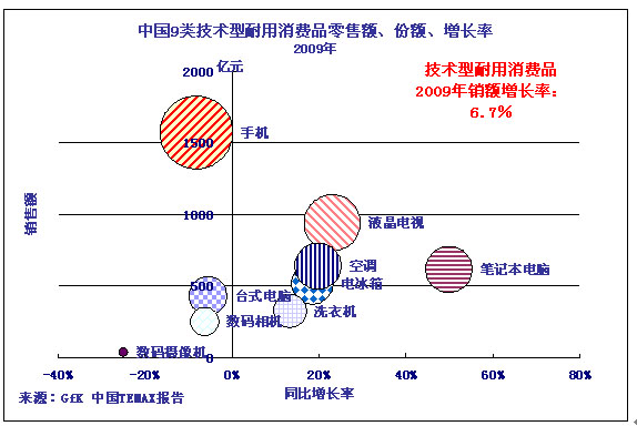 2009年,中國技術(shù)型耐用消費(fèi)品零售總額8442億元(按1美元=6.82元人民幣計(jì)算,為1238億美元),比2008年增長6.7%。這一數(shù)字略低于2008年的同比增長率7.7%,但是,考慮到中國經(jīng)濟(jì)經(jīng)歷了2008年末開始的經(jīng)濟(jì)危機(jī)、2009年上半年的前景不確定性等不利因素,2009年中國技術(shù)型耐用消費(fèi)品市場還是交出了一份令人比較滿意的答卷。