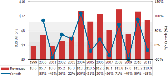 今年許多擴(kuò)廠及新建的Fab廠計(jì)劃設(shè)備將在2011年設(shè)置完成,但相對也埋下一些隱憂,屆時(shí)產(chǎn)能全部開出時(shí),需求成長率將必須維持在高點(diǎn),否則將有供過于求的風(fēng)險(xiǎn)。