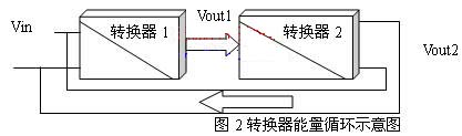 要實(shí)現(xiàn)節(jié)能循環(huán)利用,主要考慮將消耗在電阻負(fù)載上的能量更加合理的利用。如果能將輸出電壓Vout再還原為輸入電壓Vin,則輸出電能轉(zhuǎn)換為輸入的電能,便可以實(shí)現(xiàn)電能的循環(huán)利用,如圖2所示:將原有轉(zhuǎn)換器的電阻負(fù)載R1用等效輸入阻抗的轉(zhuǎn)換器2取代,轉(zhuǎn)換器2的輸出接轉(zhuǎn)換器1的輸入。則與R1等效輸入阻抗的轉(zhuǎn)換器2從轉(zhuǎn)換器1輸出端消耗的能量被轉(zhuǎn)換到轉(zhuǎn)換器1的輸入端,再經(jīng)轉(zhuǎn)換器1又到轉(zhuǎn)換器2的輸入端,實(shí)現(xiàn)了能量的循環(huán)利用。如果在理想情況下,沒(méi)有轉(zhuǎn)換損耗,則系統(tǒng)可以自循環(huán)工作。當(dāng)然這是無(wú)法實(shí)現(xiàn)的,所以在能量分析時(shí),要引入轉(zhuǎn)換過(guò)程的消耗。