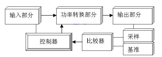 從以上能量反饋系統(tǒng)工作分析可知,能量反饋部分為系統(tǒng)穩(wěn)定工作提供必要的保證,能量反饋部分組成可由圖5所示,主要包括:輸入部分、功率轉(zhuǎn)換部分、輸出部分、采樣、基準(zhǔn)、比較器和控制器七個(gè)組成部分。