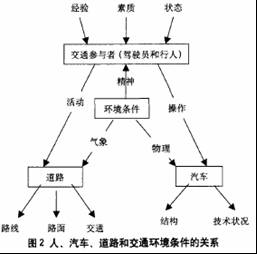 汽車道路交通事故是世界性的災(zāi)害,因此汽車交通安全也是世界性的難題。道路交通事故引起人的傷亡,財(cái)產(chǎn)的損失,給國民經(jīng)濟(jì)也帶來了巨大的損失。然而誘發(fā)交通事故的因素是多方面的,它受汽車行車速度、道路條件、車輛狀況、駕駛員行為、駕駛員的文化素質(zhì)和自然環(huán)境等因素的綜合影響。其中人、汽車、道路、環(huán)境條件是影響道路交通安全的主要因素,它們之間的關(guān)系見圖2。