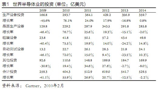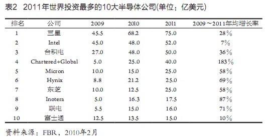 又據(jù)FBR市場(chǎng)調(diào)研公司發(fā)表的報(bào)告,世界半導(dǎo)體業(yè)的總投資額2009~2011年分別為257億美元、406億美元和495億美元,和Gartner公司所報(bào)基本相同。該公司又稱(chēng),這3年世界最大25家半導(dǎo)體公司的投資,占到整個(gè)半導(dǎo)體業(yè)投資的近90%。2009~2011年世界投資最多的l0家半導(dǎo)體公司如表2所示。