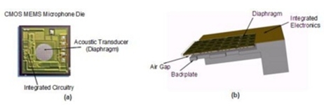 在CMOSMEMS平臺(tái)上開(kāi)發(fā)的單塊集成電路硅晶麥克風(fēng)解決方案使消費(fèi)電子設(shè)備設(shè)計(jì)人員和制造商得以避免眾多ECM相關(guān)問(wèn)題。下圖是一個(gè)單芯片硅晶麥克風(fēng)的俯視圖和橫截面圖。這一單塊芯片由MEM換能器(transducer)和阻抗匹配線路組成,它也是一個(gè)帶有可移動(dòng)振膜和剛性背板的電容性傳感器。