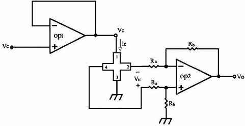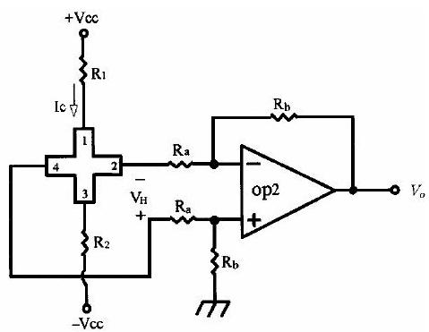 磁場(chǎng)強(qiáng)度可利用形成在結(jié)晶片的一部份的霍爾組件變換成電氣信號(hào)(參照前述霍爾組件的作用原理)。結(jié)晶通常使用半導(dǎo)體硅,霍爾組件的磁場(chǎng)靈敏度為10~20mV/K.Oe。此信號(hào)經(jīng)形成在同一結(jié)晶中的信號(hào)處理電路放大后,作為適合所定目的的信號(hào)電壓被取出。通常四根導(dǎo)線中的兩根連接于一方接地的電源,而從剩下的兩根的一根取出正極性的信號(hào)電壓,并從另一根取出負(fù)極性的信號(hào)電壓?;魻柦M件的輸入電阻通常需符合信號(hào)處理電路的電源,以便可利用定電壓使用霍爾組件。此時(shí)組件的輸出電壓不管在N型或P型均無(wú)大差異。又因輸出電壓與電子或正孔的移動(dòng)度成正比,故溫度特性也應(yīng)該盡量保持一定,這是與單體霍爾組件不同的地方。