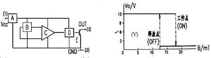 圖11是A44E集成霍耳開(kāi)關(guān),A44E集成霍耳開(kāi)關(guān)由穩(wěn)壓器A、霍耳電勢(shì)發(fā)生器(即硅霍耳片)(mT)、差分放大器C、施密特觸發(fā)器D和OC門輸出E五個(gè)基本部分組成,如圖12(a)所示。(1)、(2)、(3)代表集成霍耳開(kāi)關(guān)的三個(gè)引出端點(diǎn)。在輸入端輸入電壓VCC,經(jīng)穩(wěn)壓器穩(wěn)壓后加在霍耳電勢(shì)發(fā)生器的兩端,根據(jù)霍耳效應(yīng)原理,當(dāng)霍耳片處在磁場(chǎng)中時(shí),在垂直于磁場(chǎng)的方向通以電流,則與這二者相垂直的方向上將會(huì)產(chǎn)生霍耳電勢(shì)差HV輸出,該HV信號(hào)經(jīng)放大器放大后送至施密特觸發(fā)器整形,使其成為方波輸送到OC門輸出。