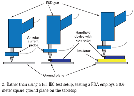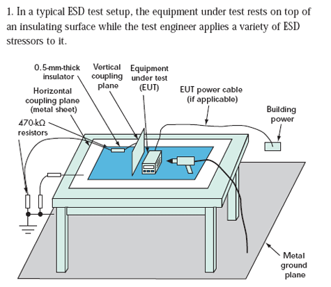 對于小型產(chǎn)品來說,工程師經(jīng)常在專門的測試環(huán)境中執(zhí)行系統(tǒng)級ESD測試(圖1)。對IEC61000-4-2測試而言,這些測試環(huán)境包括:地板上的金屬接地板、木桌、放在桌子上的金屬水平耦合板(到接地板有個0.95米長的連線,在水平耦合板之上的一個0.5mm絕緣層)。