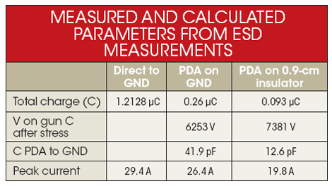 對充電到PDA的電流進行積分,可以得到從ESDqiang轉(zhuǎn)移到PDA的電荷數(shù)量。從ESDqiang轉(zhuǎn)移到PDA的電荷量可以用來計算ESDqiang的150pF電容上剩下的電壓,然后再算出PDA上的電壓。理解這個電壓以及PDA上測到的電荷之后,就可以計算出PDA和接地板之間的電容(見表1)。
