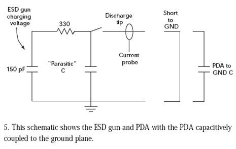 向PDA的放電通過一個并行平板電容表示,其中一個極板是PDA的一部分,另一個極板是接地板。在脈沖初期,PDA電容提供較低的阻抗,注入進PDA的電流近似于到地的放電電流。繼續(xù)施加脈沖,電荷在PDA到接地板電容中累積,因此PDA上的電位上升,直到PDA和接地板之間的電位和150pF電容上的電壓相等。這時,不再有電流流動,即使ESDqiang的電容還沒有完全放電。