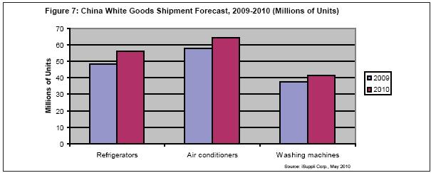 圖7所示為2009和2010年上述三大白色家電的中國市場出貨量預(yù)測。