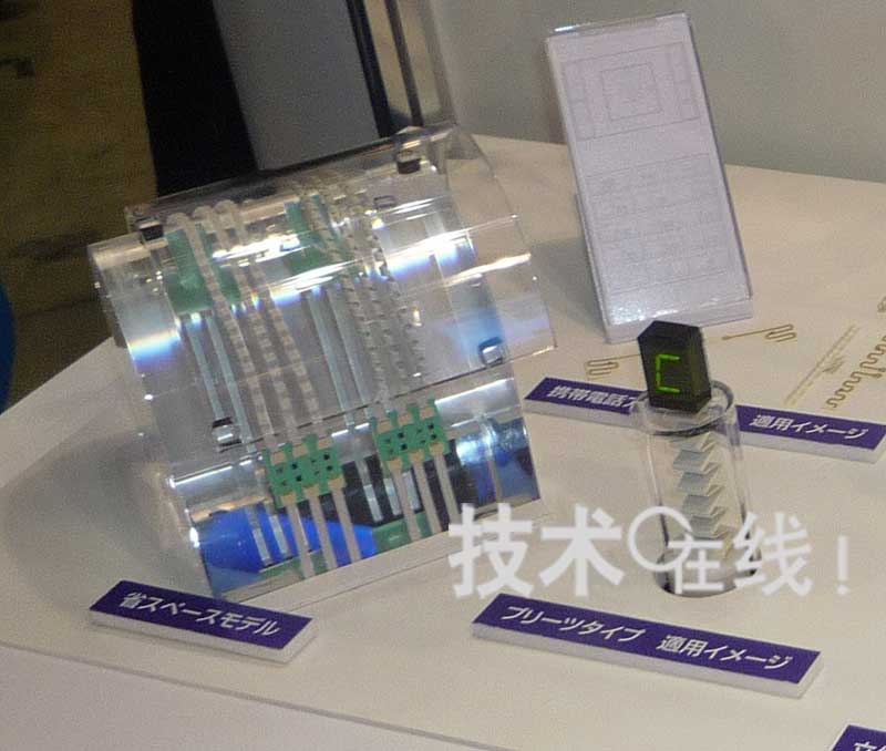 此外,還展示了將底板制成與設(shè)備縫隙一致的形狀,從而易于封裝并可有效利用縫隙的實例。展出了將封入了天線的底板切成圓形,以及與手機(jī)外殼形狀相同的底板。