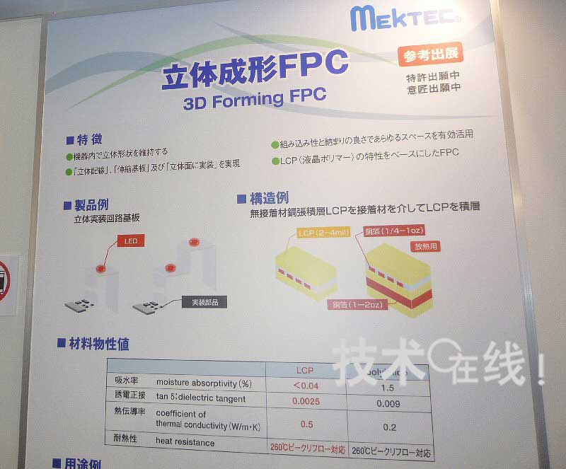 日本Mectron可立體成型的柔性底板“立體成型FPC”在“JPCA Show 2010”(2010年6月2~4日)上參考展出。該底板由熱可塑性液晶聚合物和銅箔構(gòu)成,形成希望的構(gòu)造并加熱后冷卻,可以保持其形狀。預(yù)定在2010年度內(nèi)完成技術(shù)開發(fā),2011年度開始量產(chǎn)。