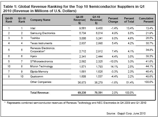 在全球排名前10的半導體供應商中,2010年第一季度有六家銷售收入高于2009年第四季度。表1所示為iSuppli公司對2010的第一季度全球10大半導體供應商的排名。