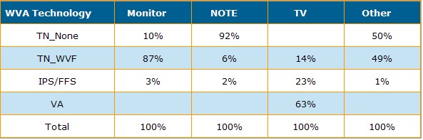 在 Quarterly Wide Viewing Angle Technology Report, (DisplaySearch季度廣視角技術(shù)出貨報(bào)告) 中,DisplaySearch 追蹤了各面板廠商在不同視角技術(shù)面板的出貨應(yīng)用與出貨尺寸。LG Display是TN型出貨的全球領(lǐng)先,2010年第一季TN面積市占率達(dá)到29%,三星以及新奇美(Chimei Innolux)則在TN-WVF (TN加廣視角膜)的市占率并駕齊驅(qū),都達(dá)到22%。另外以IPS/FFS而言,LG Display以88%的面積市占率領(lǐng)先,VA出貨則由三星以39%的面積市占率領(lǐng)先。