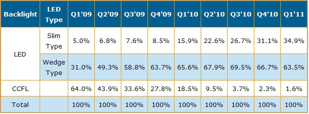 DisplaySearch表示,目前在筆記本電腦面板的LED Backlight的部份有兩種結構: 薄型(Slim Type) 與楔形(Wedge type);其差異主要是在導光板(Light Guide Plate)的技術與背光板結構。薄型(Slim Type) LED Backlight 可將面板厚度降到3.0mm-3.6mm而楔形(Wedge type) LED Backlight的Notebook面板厚度則為 5.2mm-5.8mm 。此外,薄型(Slim Type) LED Backlight 的質量與工藝水平的要求均相對較高,且需要用到薄型化的材料及組件如LED 光條、導光板等等。