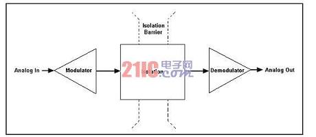 在一個理想的隔離放大器中,其模擬輸出信號與模擬輸入信號完全相同。圖7中標(biāo)記為“隔離”的部分采用了之前章節(jié)中討論的技術(shù)(光耦合、電容耦合或感應(yīng)耦合)之一,以跨過隔離層傳遞信號。調(diào)制器電路為隔離電路對信號進(jìn)行預(yù)處理。對于光學(xué)耦合方法,您需要對該信號作量化處理,或?qū)⑵滢D(zhuǎn)換為變化的光強(qiáng)。對于電容耦合方法和感應(yīng)耦合方法,您需要將該信號轉(zhuǎn)換為變化的電場或磁場。然后,解調(diào)器電路讀入隔離電路的輸出,并將其轉(zhuǎn)化回最初的模擬信號。