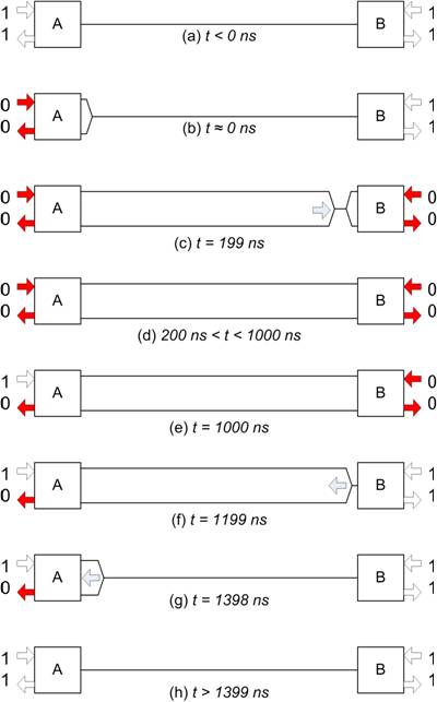 圖3中,節(jié)點A在時間t=0時開始一條消息,從而在總線(b)上傳輸一個占用位。如圖2所示,其可能出現(xiàn)的情況是,節(jié)點B剛好在節(jié)點A的信號被接收到以前(c)開始發(fā)送,也即時間t=199ns。當(dāng)時間t=1000ns的第二位開始之初,在節(jié)點A轉(zhuǎn)到非占用狀態(tài)以前兩個節(jié)點都沒意識到對方的有效性。然后,節(jié)點B在時間t=1199ns的第二位開始之初,轉(zhuǎn)到非占用狀態(tài)。另一個單向延遲以后,該非占用信號到達(dá)節(jié)點A,時間t=1399ns。只有在這時,節(jié)點A才讀取RXD信號,并且可以確定其代表網(wǎng)絡(luò)的真實狀態(tài)。