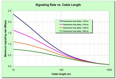 下面顯示了信號速率和線纜長度之間的權(quán)衡因素,以及收發(fā)器延遲帶來的影響。收發(fā)器帶來的延遲(包括相關(guān)隔離、電平轉(zhuǎn)換和保護(hù))對于500kbps及以上的信號速率特別明顯。